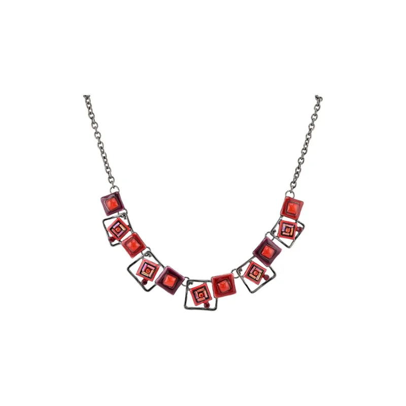 Questa collana fantasia si distingue per il suo design decisamente moderno, composto da elementi geometrici che si scontrano con eleganza. La successione di quadrati e rettangoli in metallo argentato e resina colorata crea un affascinante gioco di forme. Le sfumature di rosso e bordeaux aggiungono un tocco di colore vibrante che attira lo sguardo. Questo pezzo audace saprà valorizzare sia un abito da sera che un look casual chic per tutti i giorni.