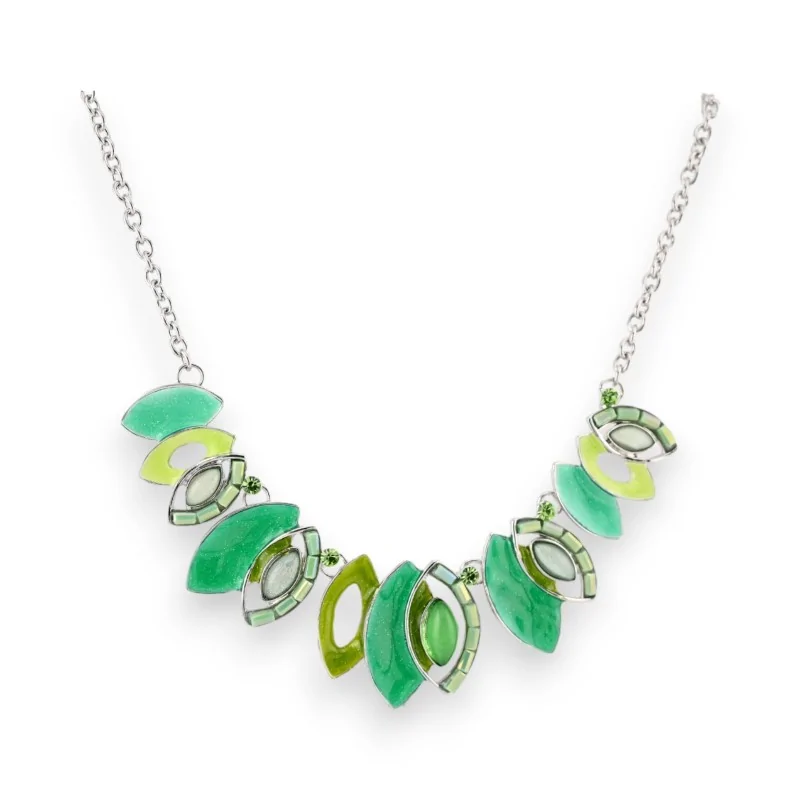 Il cuore di questa collana è ornato da una sfumatura di foglie di diverse dimensioni, creando un effetto di movimento e profondità. Le sfumature di verde accuratamente scelte evocano la freschezza e la vitalità della natura. Dal verde chiaro al verde più intenso, ogni foglia apporta il suo tocco unico all'insieme, formando una composizione armoniosa ed equilibrata. Questo gioco di colori e forme rende questa collana un accessorio versatile, capace di abbinarsi a numerosi outfit.