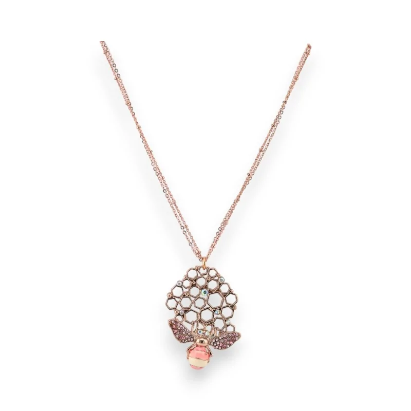 Questa collana fantasia del marchio Ikita combina eleganza e originalità. Il ciondolo a forma di alveare in metallo ramato rosato è delicatamente decorato con una piccola ape tempestata di strass. La collana è composta da due sottili catene di circa 44 cm, con un'estensione di 7 cm per una perfetta regolazione. Un gioiello alla moda che aggiungerà un tocco di raffinatezza ai vostri outfit.