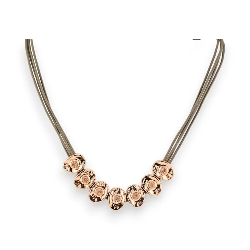 Questa collana fashion del marchio Belle Miss combina eleganza e originalità. È composta da un girocollo di 40 cm con 4 cordoncini color talpa, impreziosito da charm in metallo con finitura ramata rosata. Una prolunga di 6 cm permette di regolare la lunghezza per una vestibilità perfetta. I charm aggiungono un tocco brillante e raffinato a questo gioiello di tendenza che sublimerai tuoi outfit quotidiani.