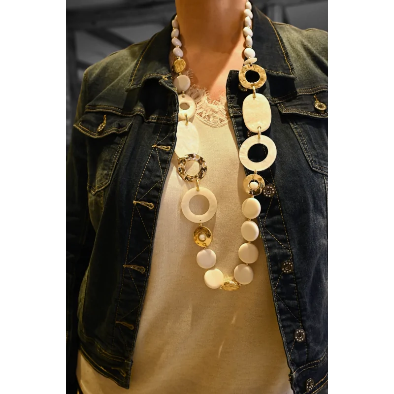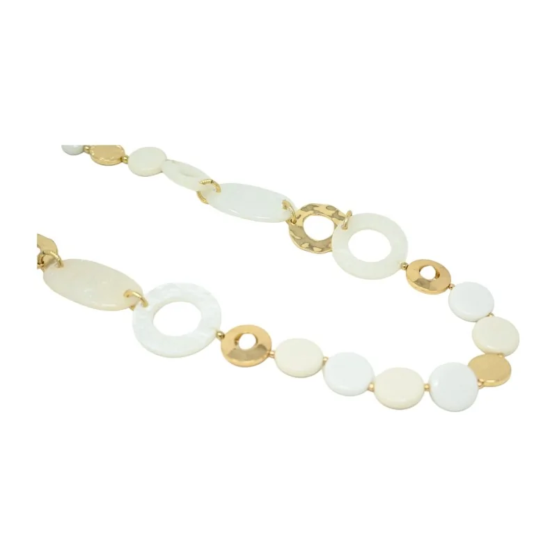 In uno spirito vintage decisamente chic, questo lungo collana dà ampio spazio a forme rotonde di diverse dimensioni, giocando su sfumature di bianco, punteggiate da dettagli dorati per una finitura brillante. Realizzato in resina, garantisce una facilità di indossabilità grazie alla sua leggerezza, posizionandosi come un must della stagione. Con la sua lunghezza di 54cm, draperà elegantemente il tuo collo, aggiungendo un tocco di originalità al tuo abito