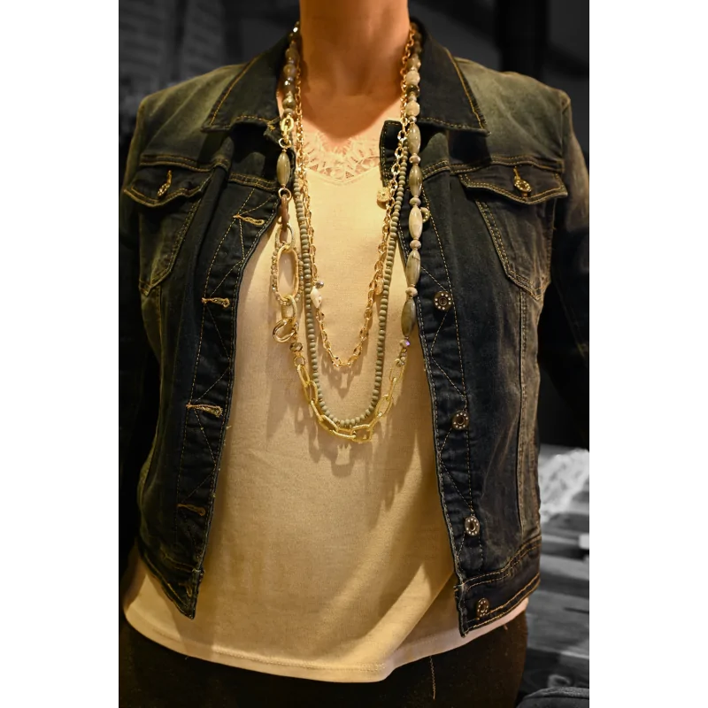 Tuffati nell'universo della raffinatezza con questa collana a più fili di fantasia, che misura 51 cm di puro brillio. Ideata per incantare, sposa abilmente le sfumature sofisticate dell'oro con l'eleganza sobria del grigio, creando un gioco di colori e luce affascinante. Le catene dorate, delicatamente intrecciate, sono accompagnate da file di pietre preziose e perle, conferendo una dimensione sia preziosa che contemporanea a questo gioiello. Progettata per la facilità come per l'estetica, ha una chiusura pratica e una catena di prolunga per un adattamento perfetto. Tuttavia, il suo disegno intelligente consente anche di infilarlo rapidamente sulla testa, offrendo un'opzione seducente per coloro che cercano di perfezionare il loro stile in un batter d'occhio. Questa collana è l'incarnazione stessa dell'eleganza accessibile, pronta a esaltare tutti i tuoi abiti.