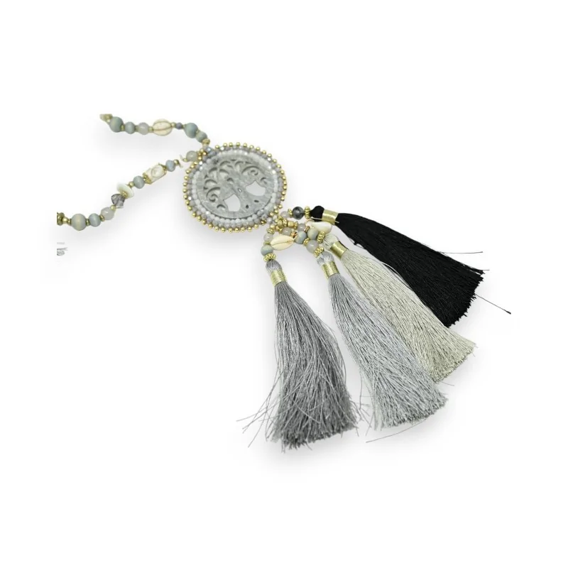 Questa collana lunga di 67 cm si distingue per la sua eleganza contemporanea, offrendo una palette di sfumature di grigio che catturano l'essenza di un minimalismo raffinato. Decorata con varie pietre e perle fantasia, questo gioiello segue un gradiente di grigio, evocando la sottigliezza dei paesaggi nebbiosi all'alba. Al centro di questo paesaggio affascinante si trova un medaglione di straordinaria bellezza, rappresentante un albero della vita traforato, simbolo di crescita e connessione. Dei delicati pon pon aggiungono un tocco di movimento e finezza, rendendo questo gioiello un'opera d'arte da indossare. Perfetto per gli amanti del design moderno, questa collana lunga è una celebrazione della vita e dell'eleganza senza tempo, un accessorio ideale per valorizzare qualsiasi outfit con un tocco di sofisticata discrezione.