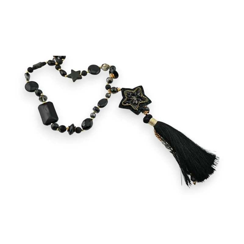 La collana lunga Eleganza Nera è un gioiello raffinato che aggiungerà un tocco di sofisticatezza a tutti i tuoi outfit. Con una lunghezza di 65 cm, questa collana lunga nera è composta da perle e vari motivi geometrici, culminando con uno splendido ciondolo a forma di stella e un soffice pompon. Il suo stile senza tempo e la sua finitura impeccabile la rendono l'accessorio perfetto per impreziosire sia i tuoi look da giorno che i tuoi abiti da sera.