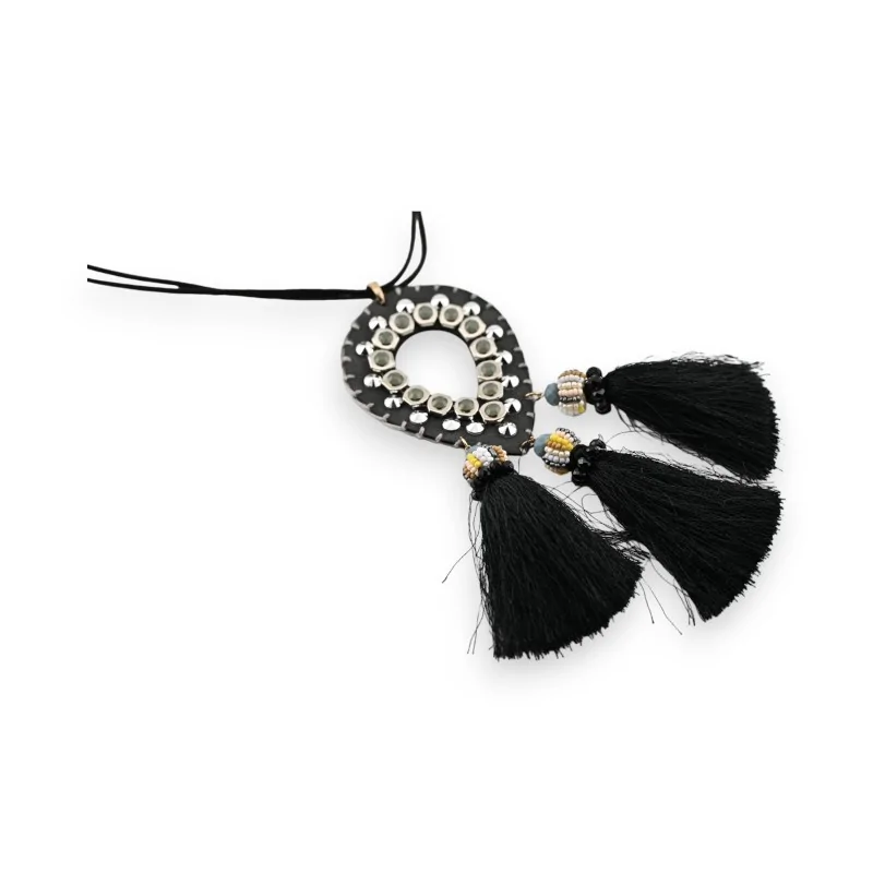 Questa magnifica collana lunga in stile bohémien misura 60 cm di lunghezza e presenta un bellissimo pendente a goccia decorato con piccoli cerchi argentati. Il pendente è impreziosito da 3 nappe nere che aggiungono un tocco di originalità e movimento. Con il suo look etnico chic, questa collana lunga sarà perfetta per accessoriare i vostri outfit estivi o i vostri look bohémien durante tutto l'anno.
