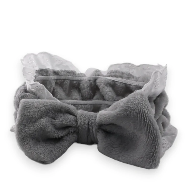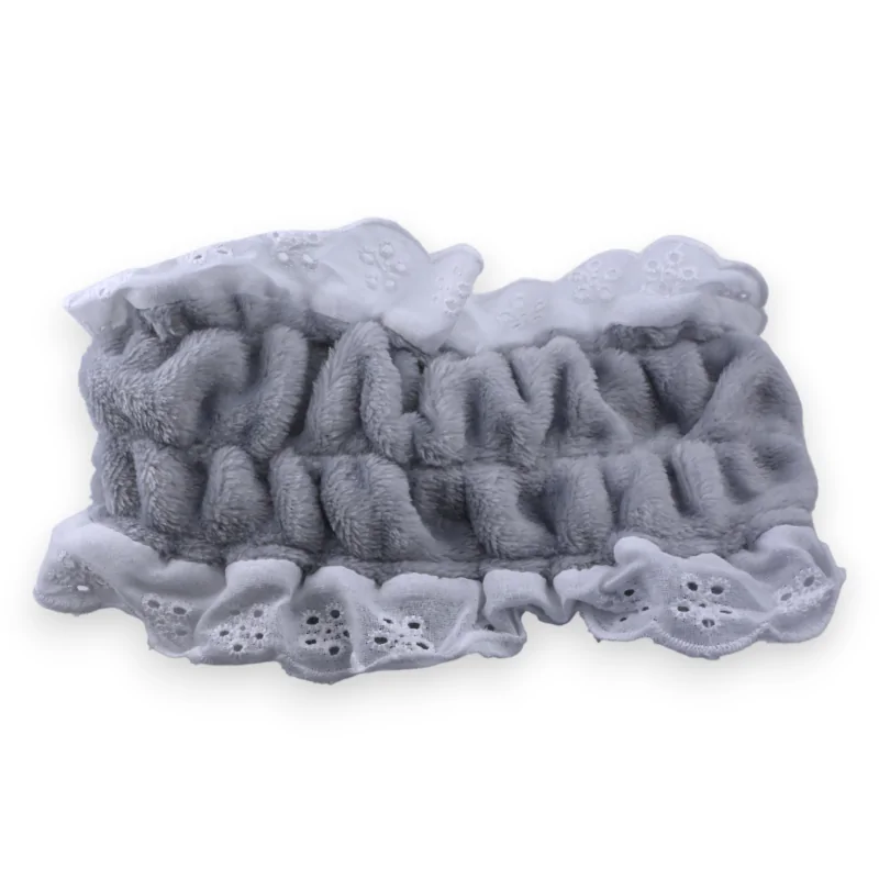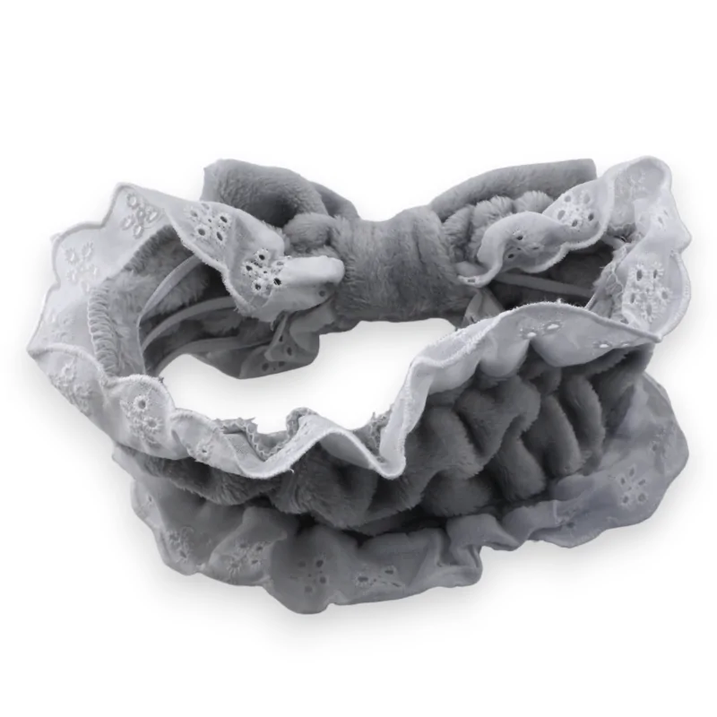Con il suo design grigio delicato in pile e la sua ricamo inglese bianco che adorna le sue estremità, questo fasciatura per il trucco è un vero vantaggio di fascino. Il nodo distintivo nella parte anteriore rafforza la sua eleganza. Pratico per tutti i tuoi momenti di cura e facile da mantenere, unisce funzionalità ed estetica per un look decisamente girly.