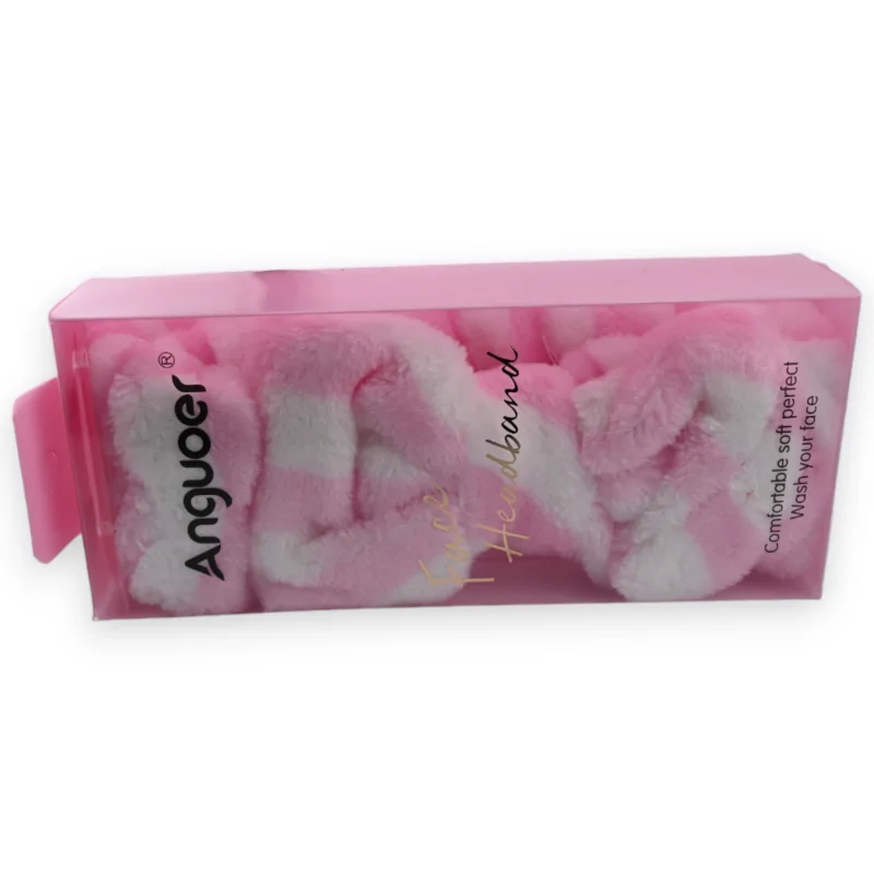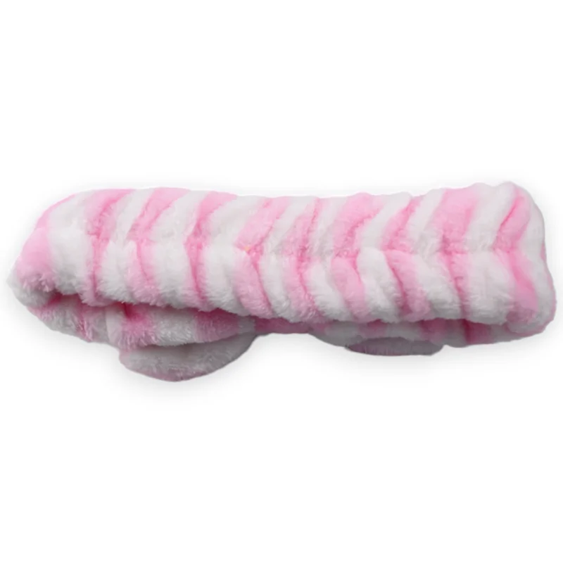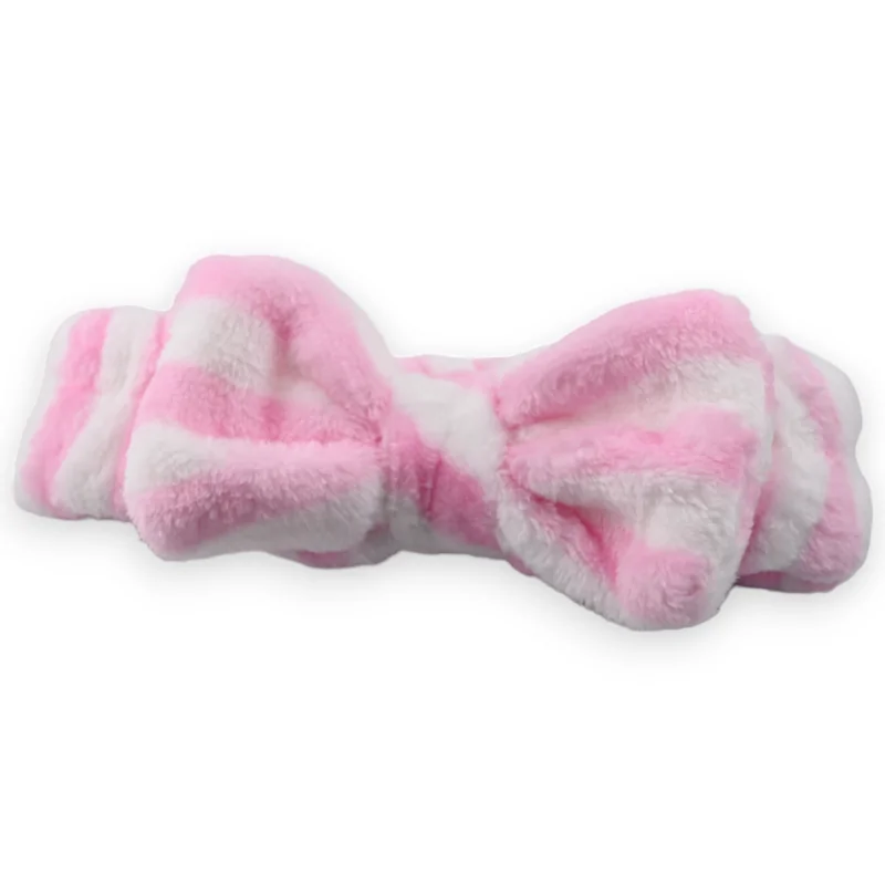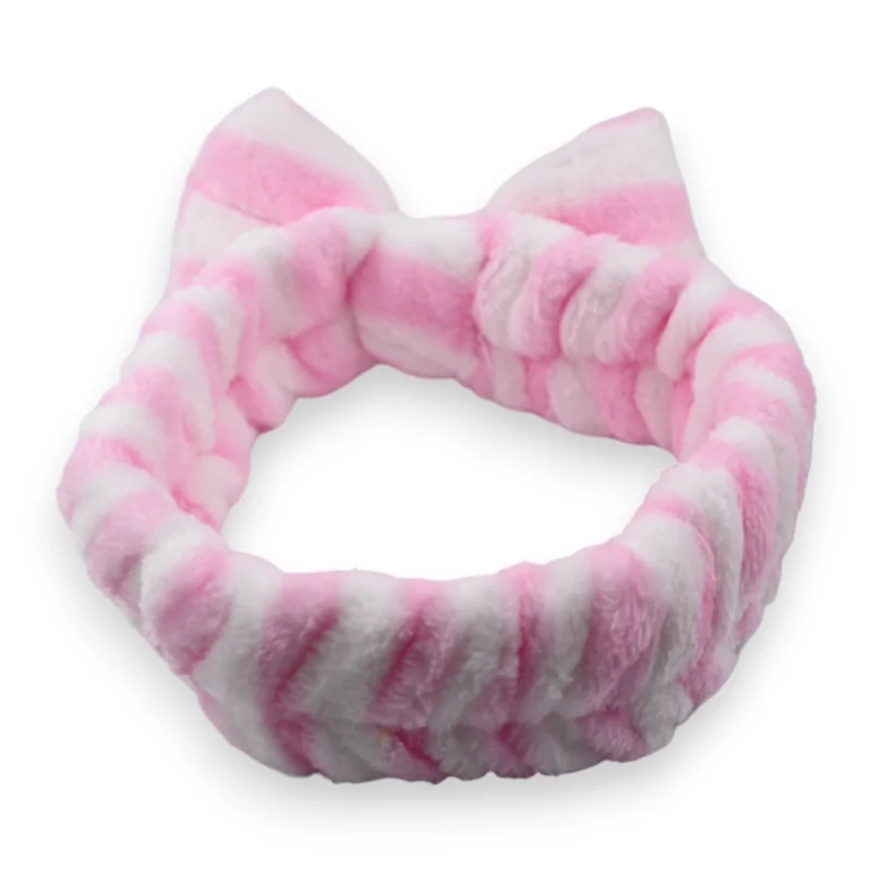Cappellino in morbido pile per trucco con sfumature di rosa e bianco, decorato con un grande nodo sul davanti. Offre un comfort ottimale durante i tuoi rituali di bellezza. Lavabile in lavatrice, diventerà presto un must nella tua trousse da toilette.