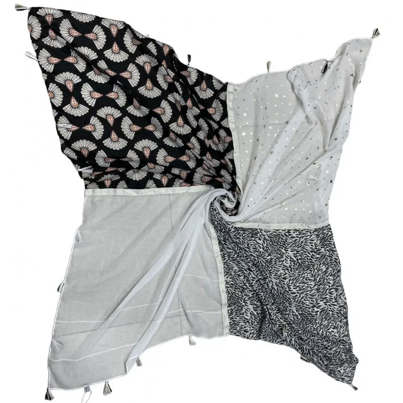 Questo foulard quadrato di 140x140 cm si distingue per il suo design innovativo e la sua estetica raffinata, offrendo non uno, ma quattro stili distinti in un unico pezzo grazie al suo unico concetto di patchwork. Ogni lato del foulard svela un mondo diverso, dove stampe di fogliame e code di pavone si dispiegano maestosamente in una palette di bianco e nero. Questa combinazione di motivi, ispirata dalla natura e dalla splendida bellezza del pavone, è resa con una finezza artistica, giocando sui contrasti e sui dettagli precisi per creare un effetto visivo sorprendente. L'eleganza monocromatica di questo foulard lo rende estremamente versatile, in grado di completare sia un elegante outfit da sera che un look casual diurno. La sua generosa dimensione permette una moltitudine di modi per indossarlo, ognuno svelando una nuova sfaccettatura della sua unica bellezza. Questo foulard è un vero capolavoro, unendo sofisticazione e versatilità.