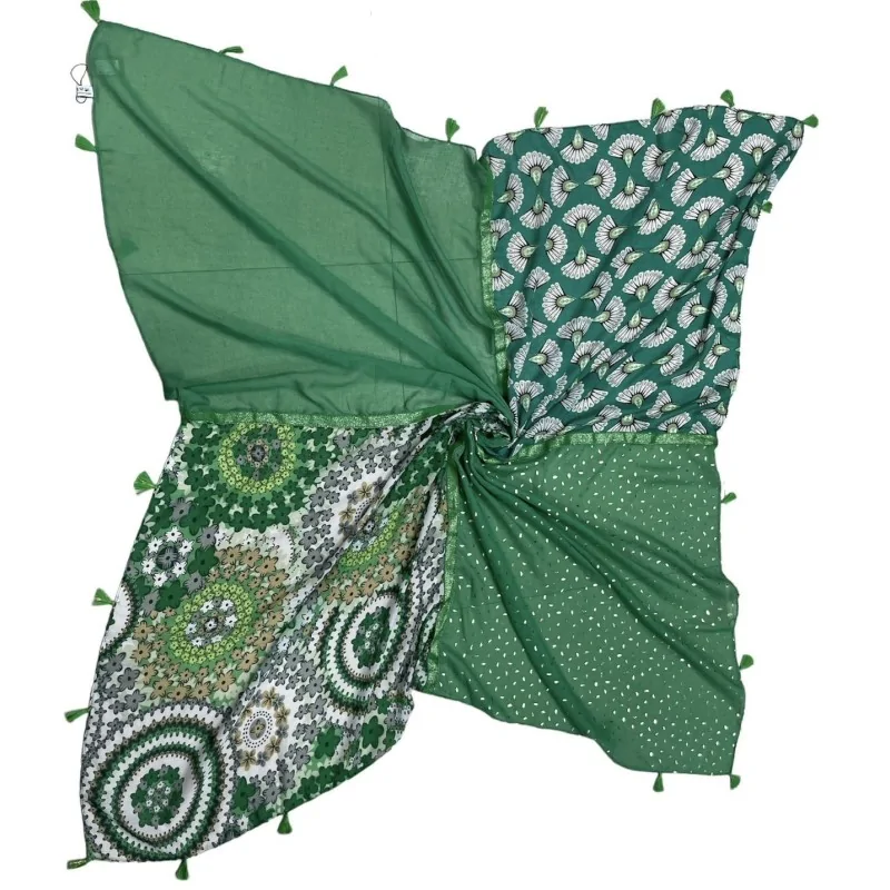 Scopri il nostro foulard patchwork, un pezzo unico progettato per aggiungere splendore alla tua collezione di accessori. Con le sue quattro facce differenti, questo foulard offre una varietà di motivi accattivanti, alternando tra stampe etniche e fiori tropicali in fucsia vivido. Realizzato interamente in cotone, questo foulard di 140x140 cm non è solo morbido e piacevole al tatto, ma anche abbastanza grande per essere stilizzato in molti modi, aggiungendo così un tocco di colore vibrante a qualsiasi outfit.