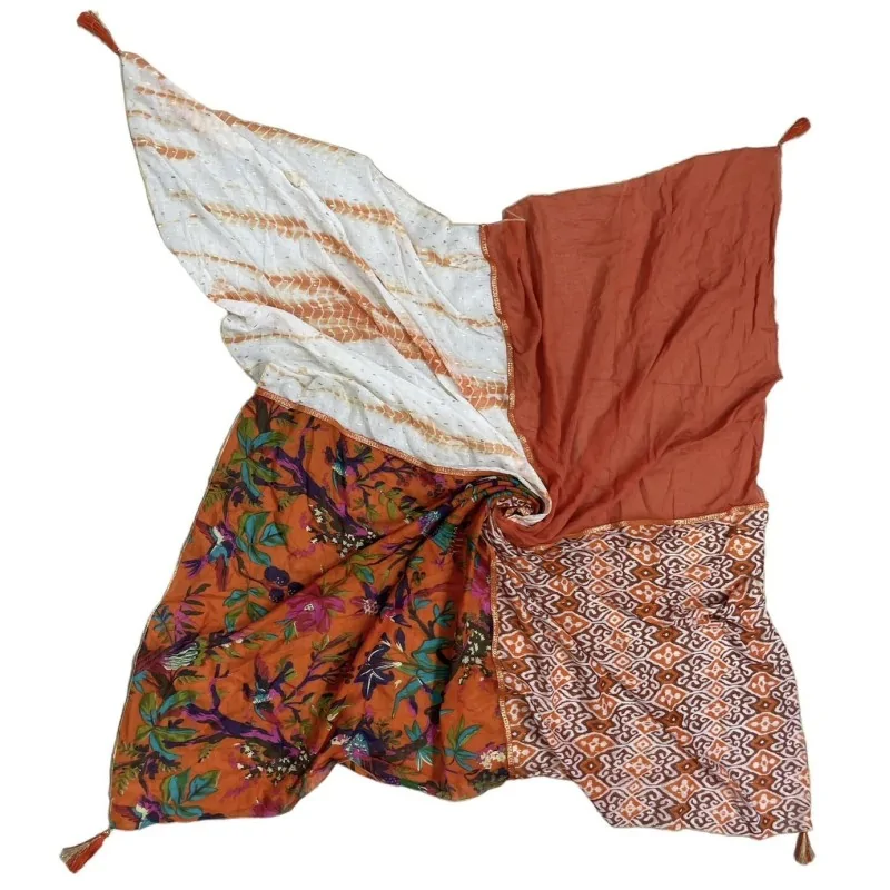 Questa sciarpa patchwork si distingue per il suo design unico, offrendo quattro disegni diversi su un unico accessorio, perfetto per coloro che apprezzano la varietà e lo stile nel loro guardaroba. Ogni lato rivela un motivo affascinante, alternando tra sofisticati stampe etniche e vibranti fiori tropicali nelle tonalità dell'arancione. Realizzata in 100% cotone, questa sciarpa di 140x140 cm garantisce non solo un comfort eccezionale, ma anche una grande versatilità, ideale per aggiungere un tocco di colore e di esotismo ai vostri outfit.