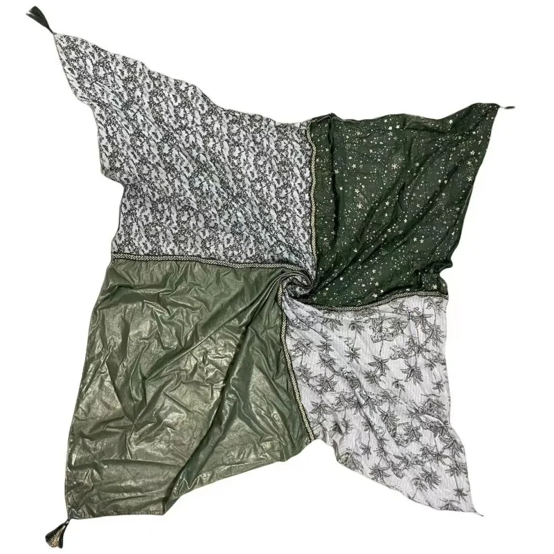Questo foulard quadrato patchwork si distingue per le sue 4 facce con vari motivi geometrici in tonalità verdi e senape. Realizzato in 100% viscosa con una generosa dimensione di 140x140 cm, aggiungerà un tocco di originalità ai vostri outfit. Il suo design unico composto da diversi motivi geometrici lo rende un accessorio versatile, perfetto per aggiungere stile a qualsiasi look. La combinazione dei colori verde e senape offre un aspetto sia di tendenza che senza tempo.