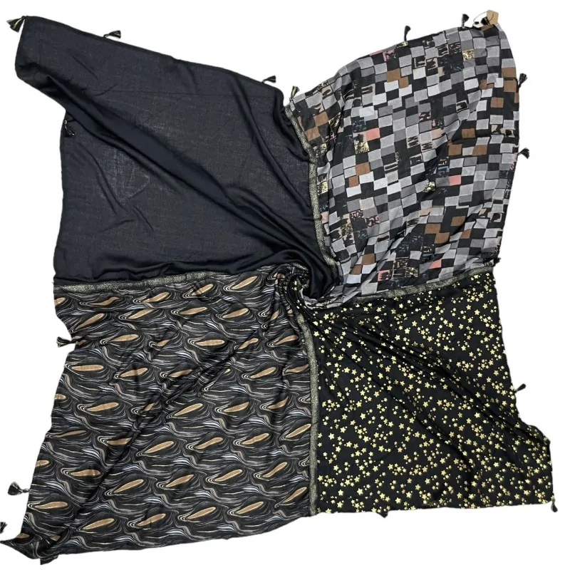 Questo foulard quadrato patchwork attirerà le amanti di accessori originali ed eleganti. Con le sue 4 facce dai motivi distinti, offre molteplici possibilità di stile. Da un lato, stelle dorate scintillano delicatamente su uno sfondo nero profondo, apportando un tocco di glamour e femminilità. Dall'altro, motivi geometrici in sfumature di nero e grigio creano un effetto grafico contemporaneo. Questa dualità permette di variare i look a seconda dei vostri desideri e dei vostri outfit.
