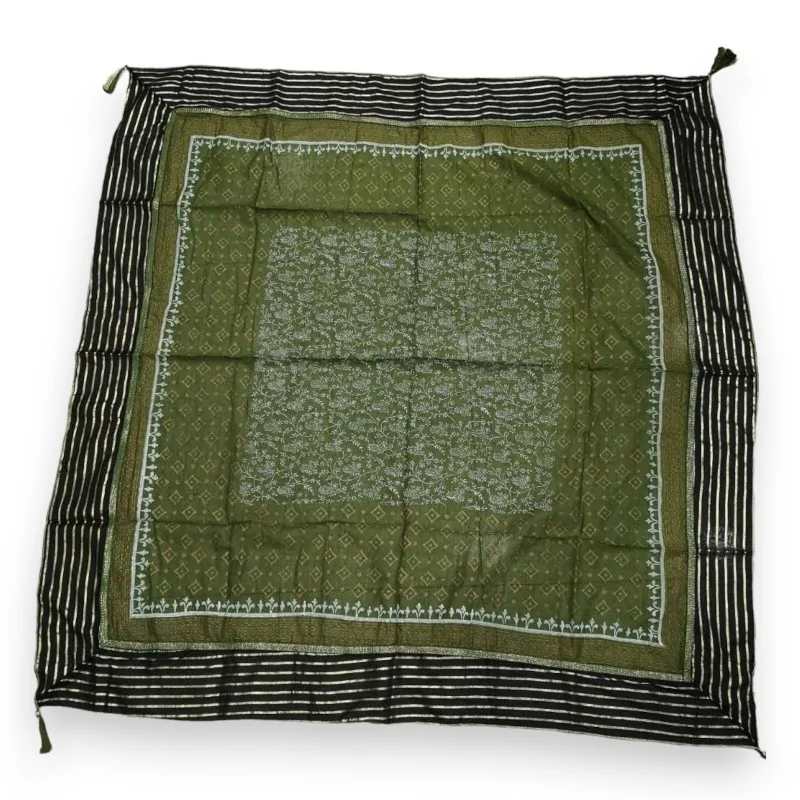 Questo splendido foulard quadrato etnico dai toni kaki e nero è l'accessorio perfetto per aggiungere un tocco bohémien chic al tuo outfit. Realizzato in morbida e fluida viscosa, presenta un elegante motivo etnico impreziosito da dettagli dorati e graziosi pompon. Con le sue generose dimensioni di 120x120 cm, può essere indossato in molteplici modi per valorizzare il tuo look.