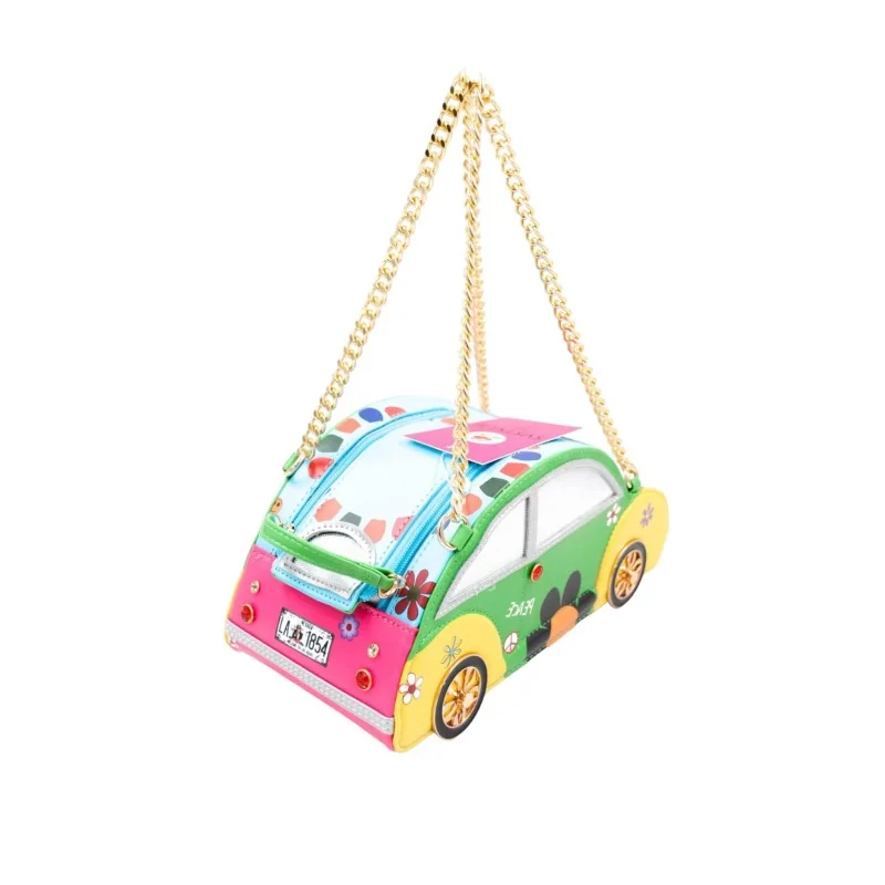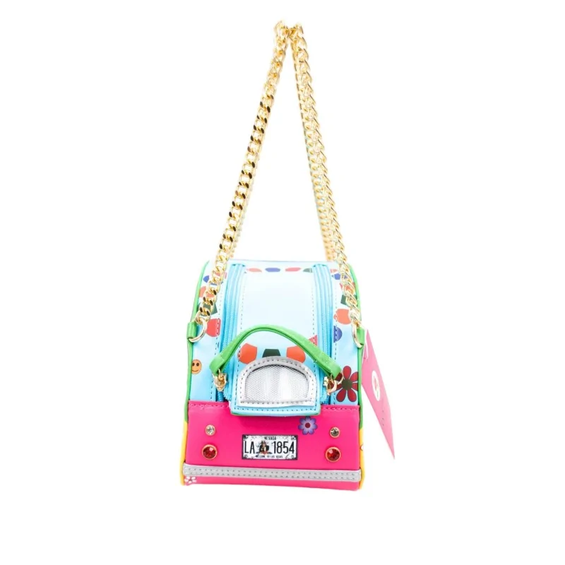 Questa borsa Peace Car si distingue per il suo design straordinario che spinge i limiti della creatività. La sua silhouette a forma di auto evoca immediatamente lo spirito degli anni '60 e il movimento hippie, con i suoi colori vivaci e i motivi Peace and Love. Le tonalità pastello si sposano armoniosamente con tocchi più vivaci, creando un accessorio che diventa rapidamente il punto focale di qualsiasi outfit. La catena dorata aggiunge un tocco sofisticato che contrasta elegantemente con l'aspetto giocoso della borsa.