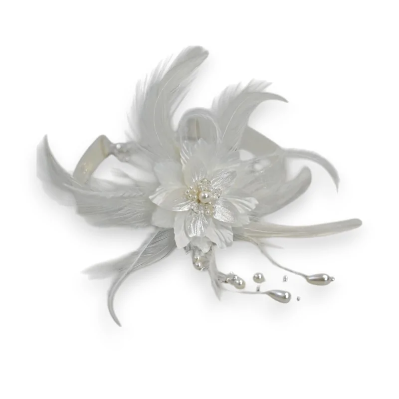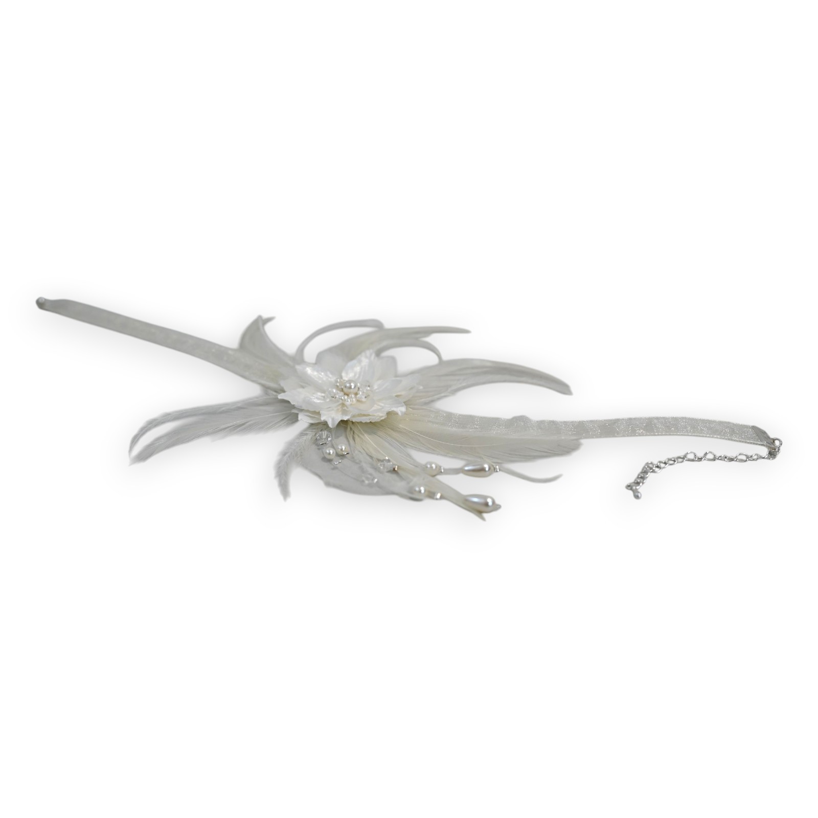 Questa magnifica collana bianca combina eleganza e delicatezza con i suoi ornamenti floreali in tessuto, le sue perle delicate e le sue piume leggere. Il suo design unico offre un perfetto equilibrio tra sofisticazione e fantasia, ideale per impreziosire sia un abito da sera che un outfit casual.