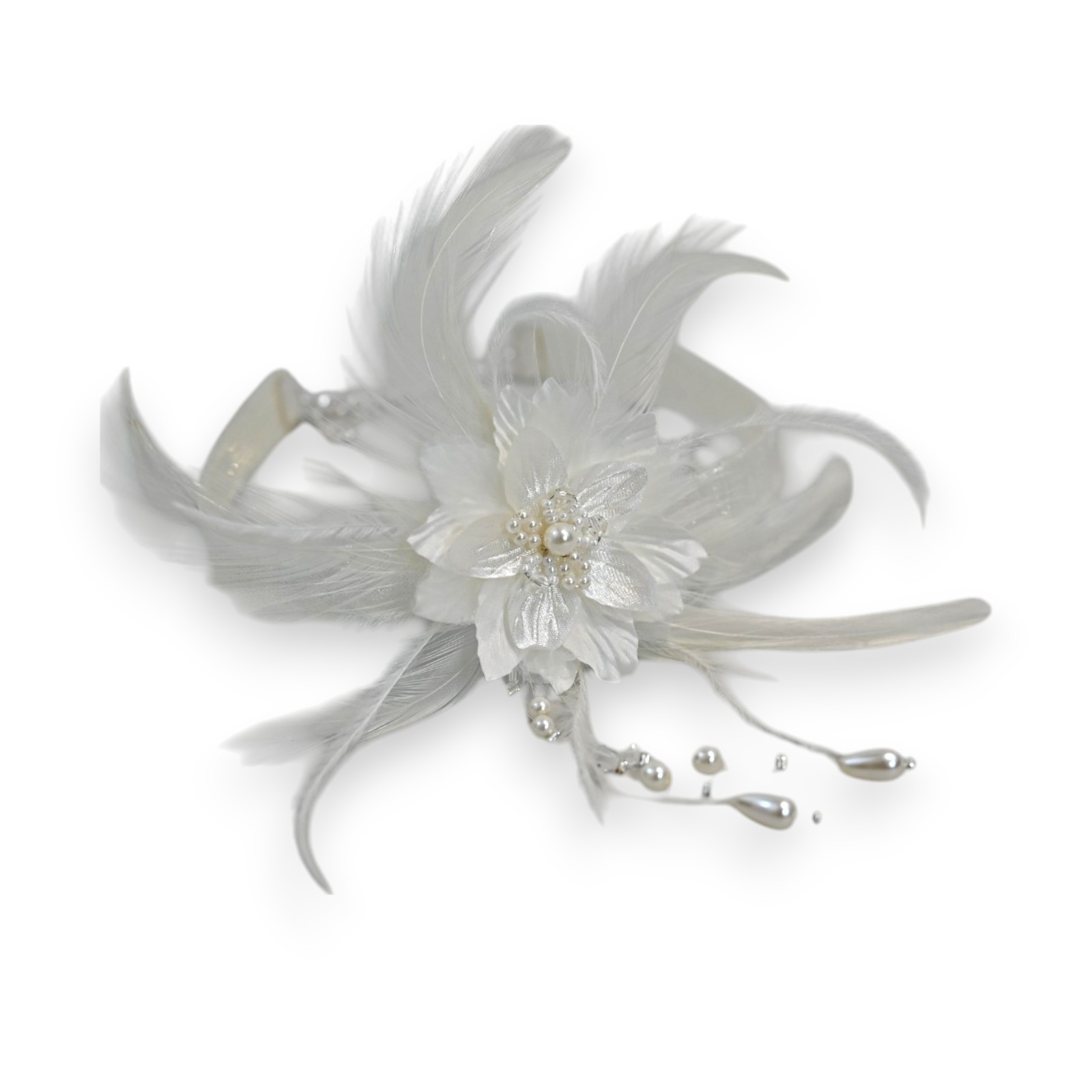 Questa collana bianca si distingue per il suo design contemporaneo che unisce brillantemente diverse texture e materiali. Il fiore centrale in tessuto, meticolosamente lavorato, costituisce il punto focale del gioiello. Le delicate perle sparse creano riflessi sottili che catturano la luce, mentre le piume bianche aggiungono un tocco di leggerezza e movimento. L'assemblaggio armonioso di questi elementi forma un pezzo sia sofisticato che romantico.
