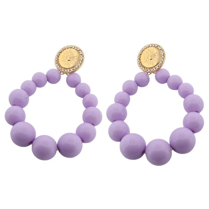 Aggiungi un tocco di eleganza al tuo outfit con questi magnifici orecchini a cerchio. Il design unico combina delicate perle color lilla di 4,5 cm di diametro con elementi dorati decorati con strass scintillanti. La leggerezza e il comfort di questi gioielli di bigiotteria li rendono una scelta ideale per tutte le tue occasioni.
