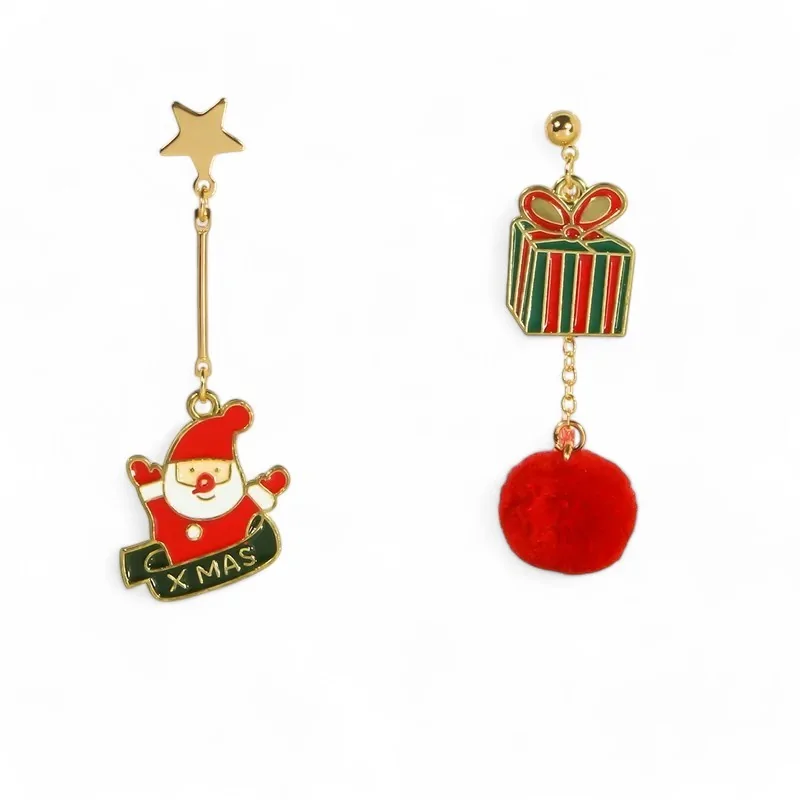 L'asimmetria di questi orecchini fantasia li rende un accessorio unico e moderno. Il contrasto tra il Babbo Natale gioviale e il regalo misterioso crea un equilibrio perfetto che attira l'occhio. I colori vivaci - il rosso, il verde e il dorato - si armonizzano perfettamente per evocare l'atmosfera calorosa delle feste di fine anno. Il metallo dorato apporta un tocco di eleganza e lucentezza che farà brillare le vostre orecchie alla luce delle illuminazioni natalizie.