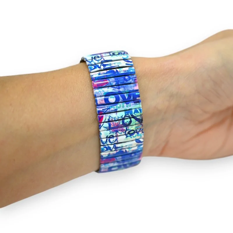 L'orologio elastico Love Ernest si distingue per il suo stile decisamente urbano e trendy. Il suo cinturino estensibile presenta motivi colorati e graffiti che richiamano l'universo della street art. I toni blu, viola e rosa si fondono armoniosamente per creare un effetto visivo sorprendente. Il quadrante non è da meno con il suo sfondo dai colori vivaci dove si può distinguere la parola "Love" scritta in grande. Questo orologio dal design unico vi permetterà di affermare la vostra personalità con stile.