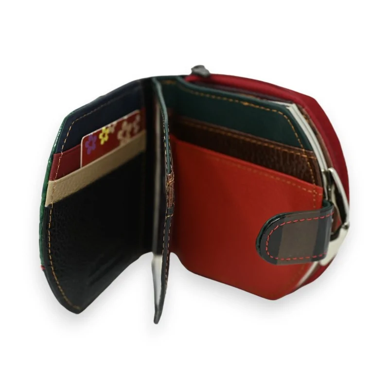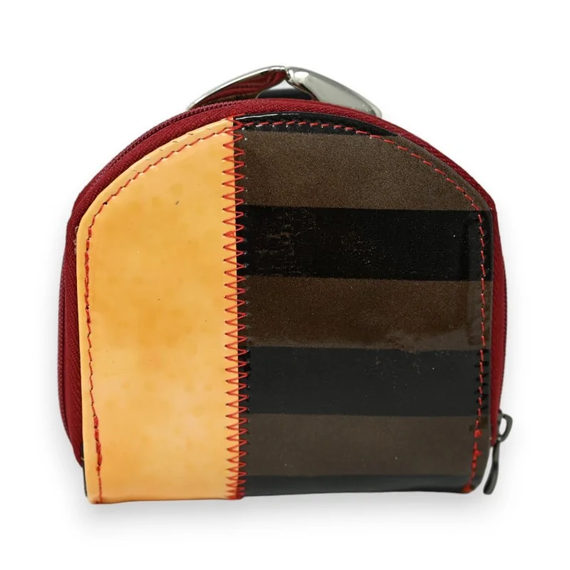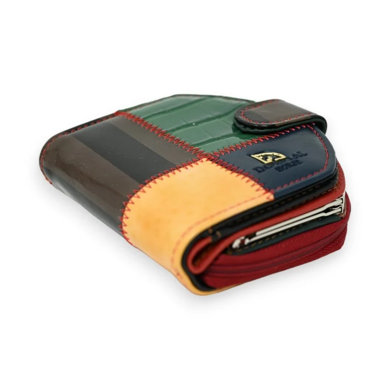Questo portafoglio compatto in vera pelle combina stile e funzionalità grazie al suo design patchwork unico che associa diverse texture e colori. Il suo pratico formato di 9x13cm lo rende l'accessorio ideale per una conservazione ottimizzata dei tuoi essenziali quotidiani.