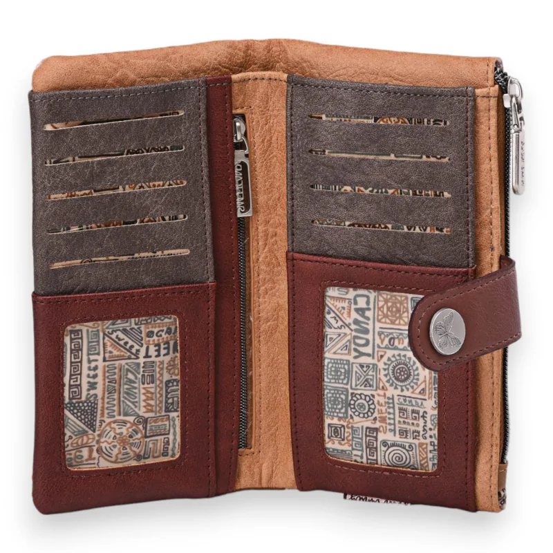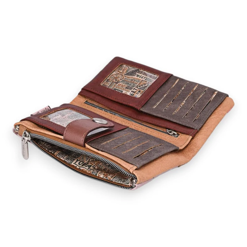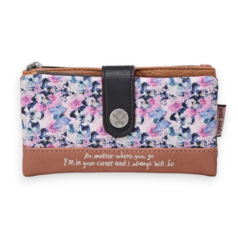 Il portafoglio Sweet & Candy è valorizzato da una magnifica stampa di giardino piena di farfalle multicolori in toni di rosa, creando un motivo dolce e rilassante. Questo modello è estremamente pratico con i suoi numerosi scomparti: ha una tasca con zip per le monete, un scomparto per le banconote e numerosi spazi per le carte. L'interno, con finiture curate, è decorato con toni di cammello e marrone, offrendo una perfetta combinazione di funzionalità ed eleganza. Dimensioni: 17,5 x 10 cm.