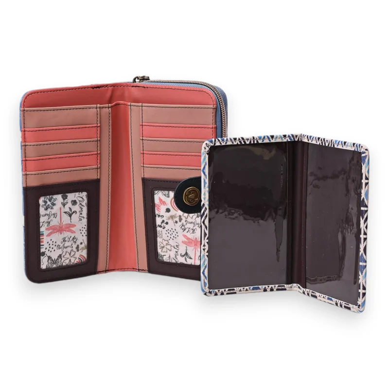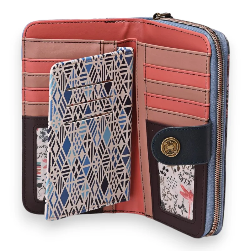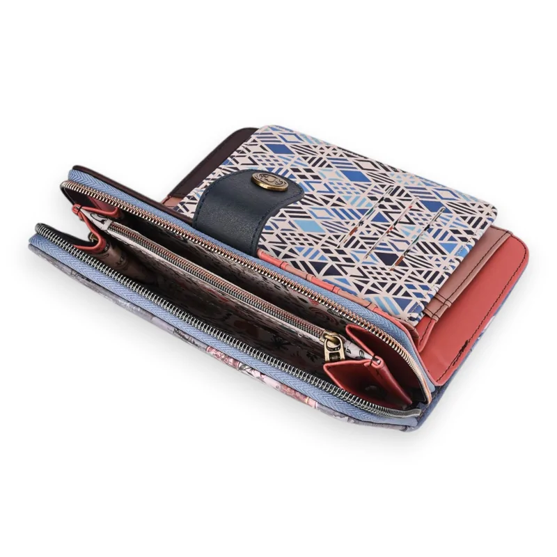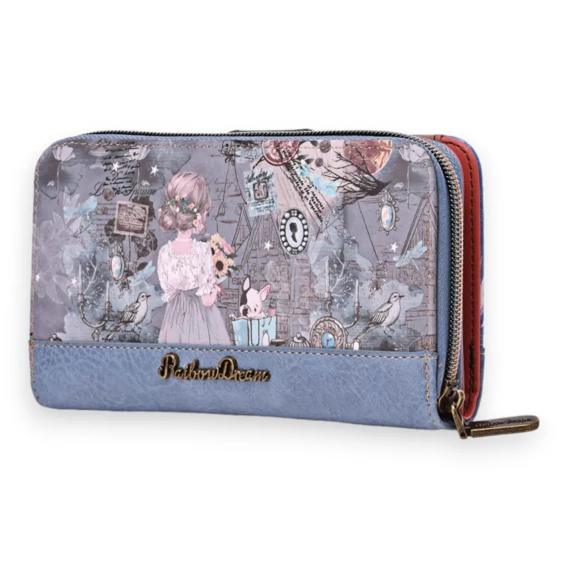 Scopri il portafoglio del marchio Sweet & Candy, illustrato con un'incantevole scena che rappresenta una bambina in una passeggiata tranquilla con il suo animale domestico, il tutto in tonalità rilassanti di blu. Questo modello pratico include uno scompartimento con zip per le monete, numerosi vani per le carte, tra cui una parte staccabile per ulteriori spazi di archiviazione, e uno scompartimento per le banconote. L'interno accogliente è decorato con colori caldi come l'arancione, il cammello e il nero, aggiungendo un tocco di comfort ed eleganza. Dimensioni: 18,5 x 10,5 cm.