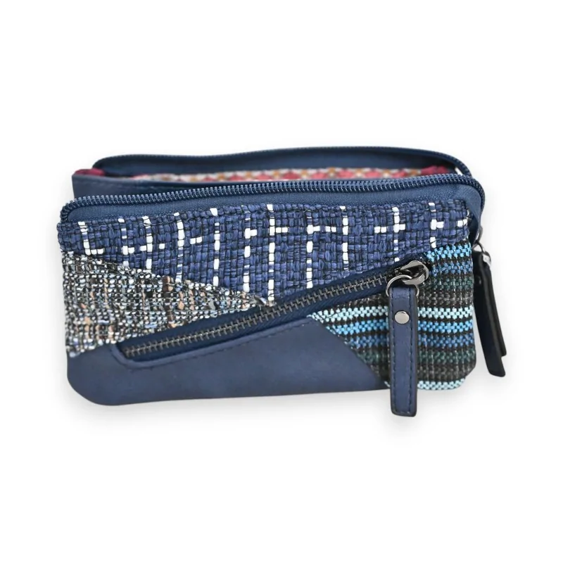 Il portafoglio Mélanie Paris si distingue per la sua estetica moderna che combina diverse texture in patchwork. La parte anteriore presenta un magnifico lavoro di tessitura in blu, impreziosito da motivi geometrici bianchi che creano un contrasto sorprendente. Questa composizione unica è completata da fasce decorative di vari toni, offrendo uno stile sofisticato e originale allo stesso tempo.