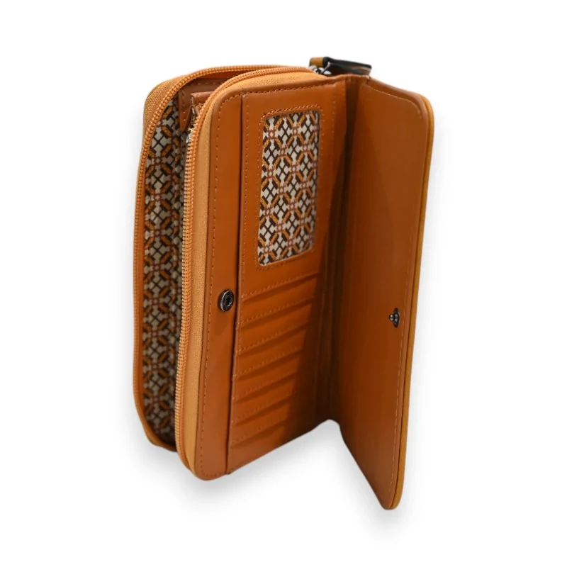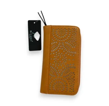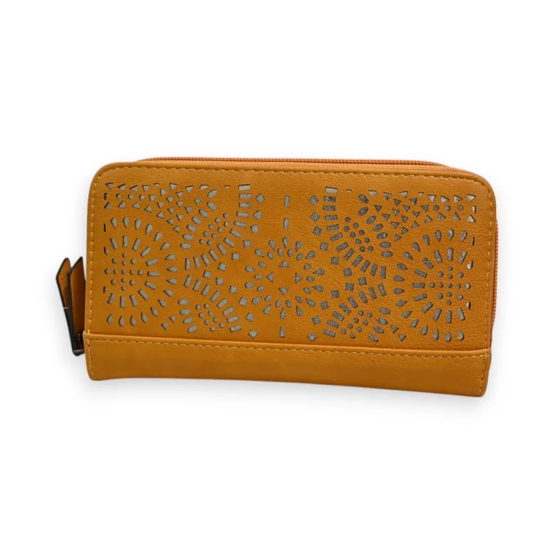 Il portafoglio Mélanie Paris unisce eleganza e funzionalità con il suo design contemporaneo. La sua trendy tonalità senape è impreziosita da motivi geometrici traforati argentati che gli conferiscono uno stile unico. Questo modello compatto di 19x11x2,5 cm offre un'organizzazione ottimale grazie ai suoi due scomparti distinti.