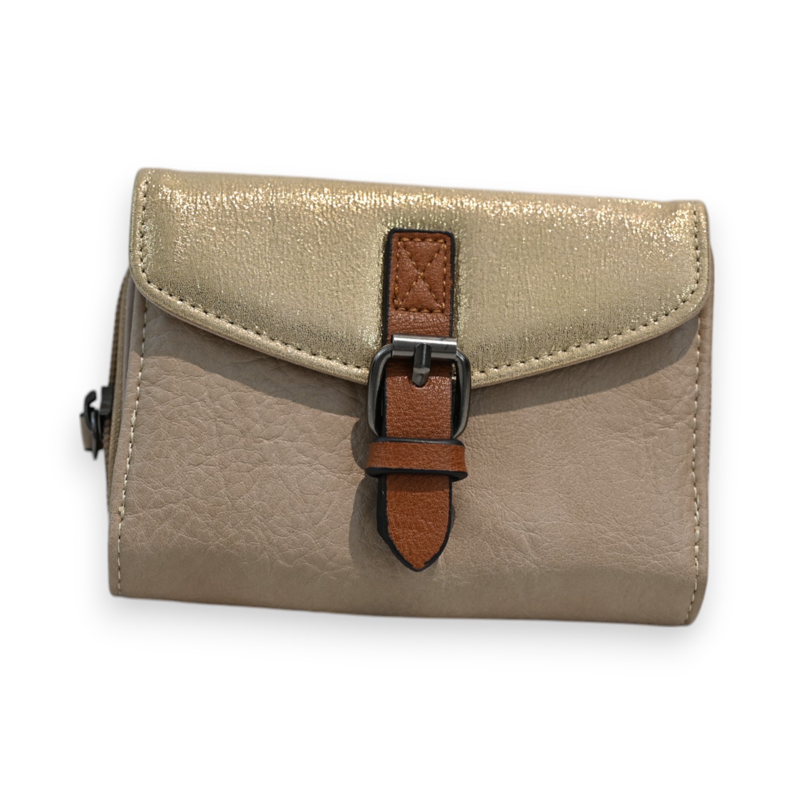 Questo portafoglio Mélanie Paris si distingue per il suo design contemporaneo che unisce sobrietà e raffinatezza. La combinazione della similpelle taupe con accenti dorati crea un contrasto elegante, mentre la cinghia color cammello aggiunge un tocco di calore all'insieme. Il risvolto superiore con finitura lucida dorata cattura delicatamente la luce, conferendo una dimensione lussuosa a questo accessorio quotidiano.