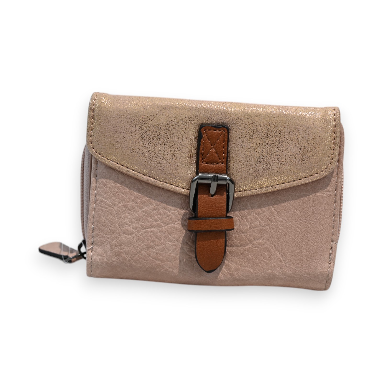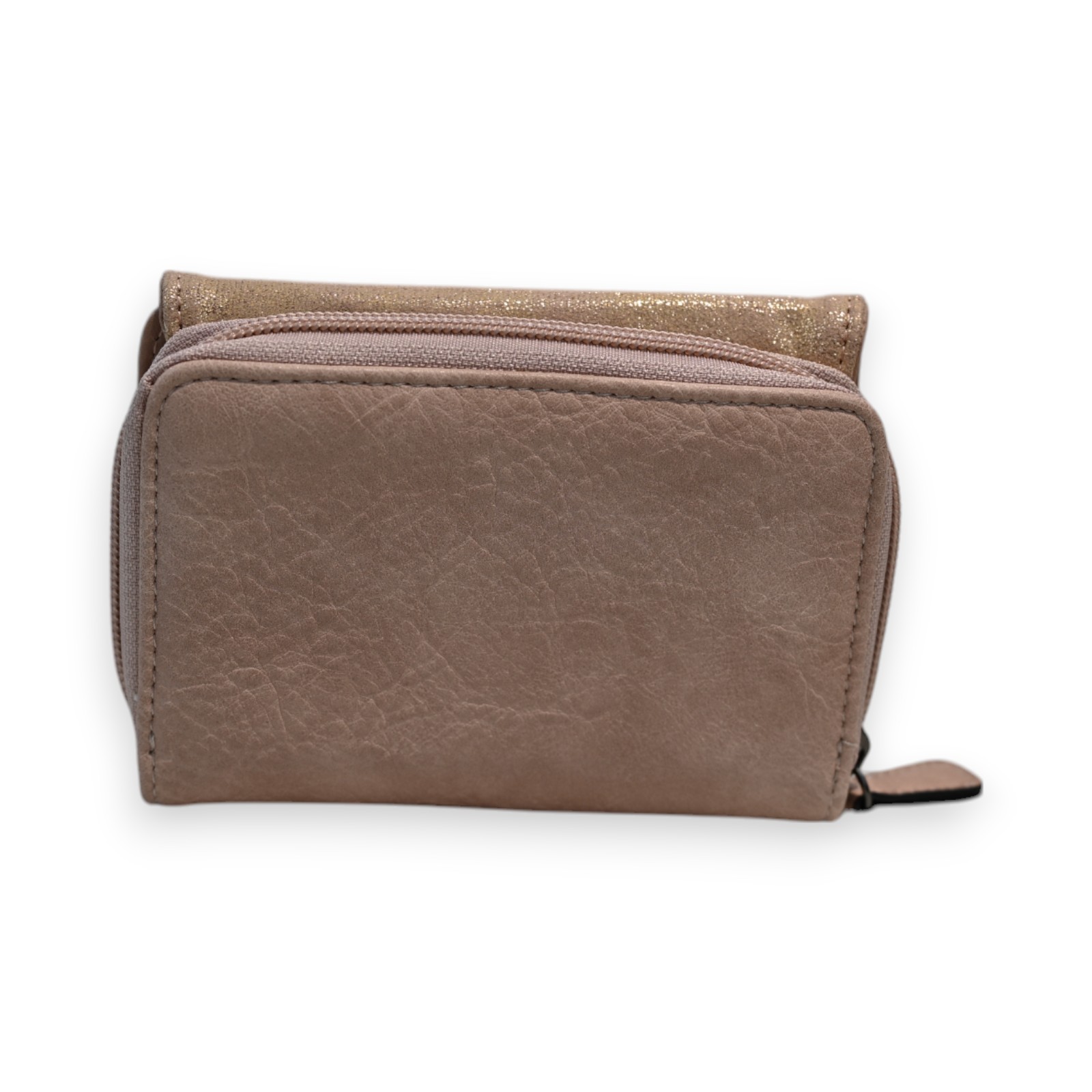 Il portafoglio compatto Mélanie Paris unisce eleganza e funzionalità in un formato ideale per l'uso quotidiano. La sua tonalità rosa antico è impreziosita da dettagli dorati che lo rendono un accessorio raffinato. La patta anteriore, decorata con una cinghia color cammello e una chiusura magnetica, offre uno stile distintivo e moderno.