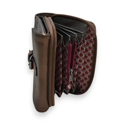 Le dimensioni compatte di 14 x 9 x 2,5 cm rendono questo portafoglio bronzo un accessorio perfettamente adatto a tutti i tipi di borse. L'apertura a fisarmonica facilita l'accesso a tutti i compartimenti mantenendo una silhouette sottile anche quando il portafoglio è pieno. Il cinturino decorativo color cammello aggiunge un tocco di eleganza fungendo anche da pratico punto di aggancio.