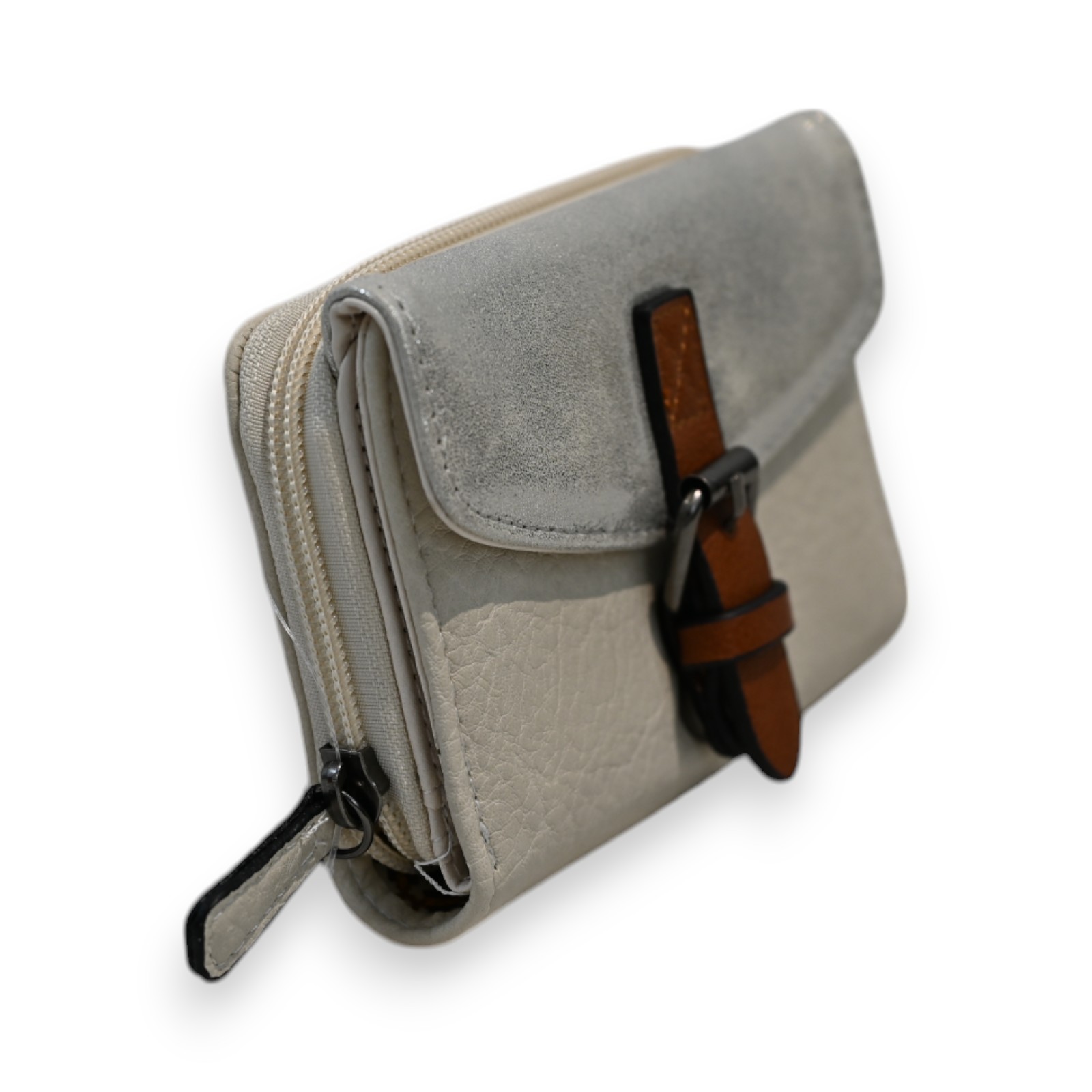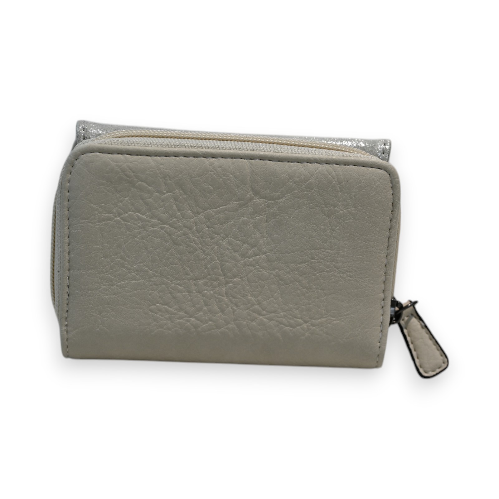 Questo portafoglio compatto del marchio Mélanie Paris si distingue per il suo design contemporaneo e la sua praticità. La combinazione del rivestimento sintetico crema e della finitura argentata lucida crea un contrasto elegante, impreziosito dai dettagli color cammello. La chiusura magnetica garantisce una chiusura sicura facilitando l'accesso ai vari scomparti. Le dimensioni perfettamente studiate di 14 x 9 x 2,5 cm lo rendono un accessorio ideale per tutte le borse.