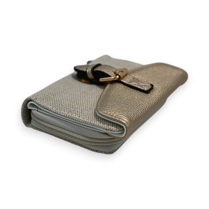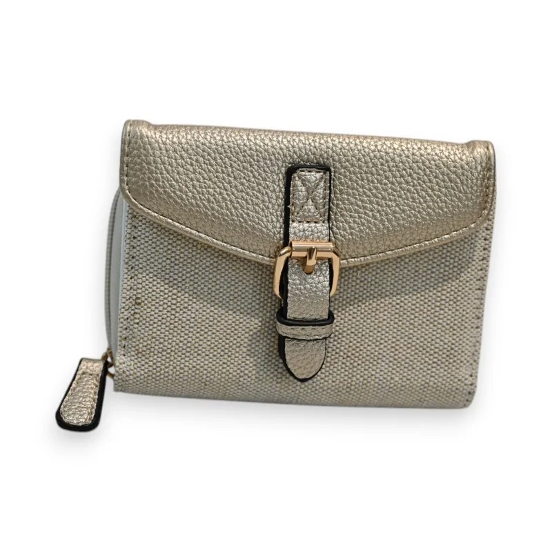 Questo raffinato portafoglio Mélanie Paris unisce elegantemente un tessuto in tela beige con dettagli in sintetico dorato. Le sue dimensioni compatte di 14 x 9 x 2,5 cm lo rendono l'accessorio ideale per l'uso quotidiano. La parte anteriore presenta una patta lucida dorata con chiusura magnetica, completata da una cinghia coordinata per uno stile contemporaneo.