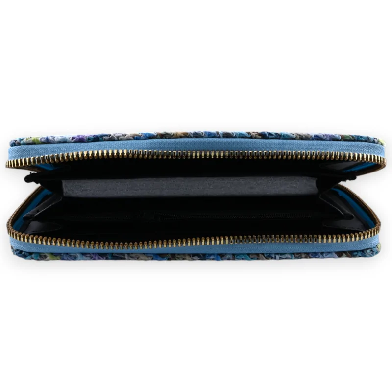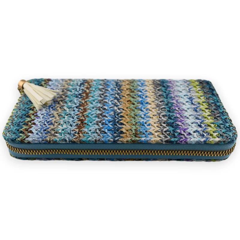 Confezionato in un unico materiale intrecciato di paglia, questo portafoglio si distingue per le sue incantevoli sfumature di blu. Offrendo una moltitudine di scomparti, è pensato per un'ottimale organizzazione. Leggero e distintivo, è l'accessorio ideale per esaltare la bellezza delle tue borse di maroquinerie.