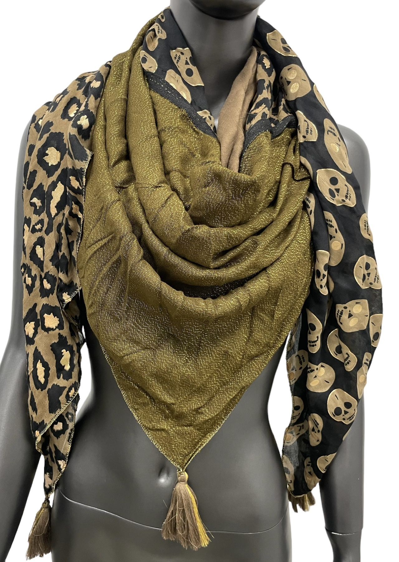 Questo foulard quadrato patchwork rivoluziona il vostro guardaroba con le sue quattro stampe accuratamente assemblate. La combinazione unica di motivi teschio e leopardo crea un contrasto sorprendente con le nuance nero e cammello, offrendo un accessorio moda versatile. Ogni sezione del patchwork racconta la propria storia armonizzandosi perfettamente con l'insieme. I dettagli dorati apportano una finitura lussuosa che trasforma questo foulard in un vero pezzo da designer. La sua grande dimensione permette molteplici modi di indossarlo: intorno al collo, come fascia, come cintura o persino come accessorio per borsa. La qualità del poliestere garantisce una tenuta impeccabile e una facilità di manutenzione apprezzabile nel quotidiano.