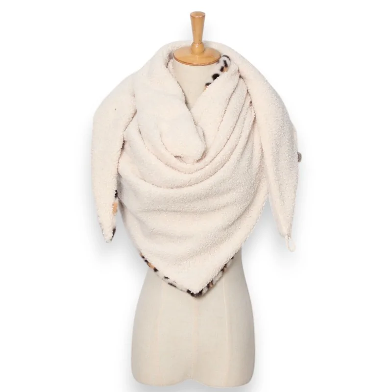 Questa sciarpa triangolare con motivo leopardato di tendenza combina morbidezza e calore per il massimo comfort questo inverno. La sua stampa beige su sfondo morbido aggiunge un tocco selvaggio al tuo outfit. La sua grande dimensione di 180x70 cm consente di indossarla in molti modi: come sciarpa classica, come scialle avvolgente o fissata con il suo grazioso bottone in legno per uno stile originale. La fodera in morbidissimo pile bouclé ti terrà al caldo durante le giornate fredde.