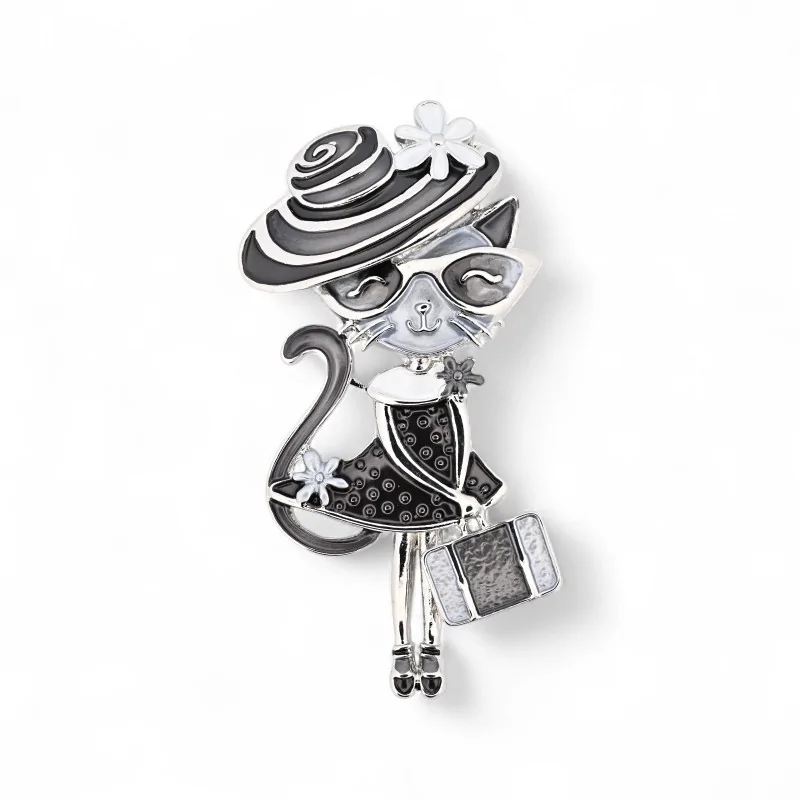 Scopri l'eleganza senza tempo con questa spilla di gatta parigina dallo stile sofisticato. Ornata da uno spettacolare cappello a spirale bianco e nero, questa signora felina incarna il chic francese. Con i suoi grandi occhiali oversize e il suo abito vintage a pois, aggiunge un tocco di sofisticazione parigina a tutti i tuoi outfit. Un gioiello magnetico elegante che celebra l'art de vivre parigino con raffinatezza e originalità.