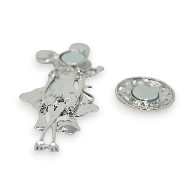 Questa elegante spilla magnetica a forma di topo è un accessorio di moda unico e affascinante. Misura 10x4cm ed è realizzata in metallo argentato di alta qualità. Il topo indossa un abito nero decorato con delicati motivi floreali, aggiungendo un tocco di fantasia al suo design. Con i suoi grandi occhi espressivi e il piccolo fiore sull'orecchio, questa spilla darà un tocco di originalità e allegria a qualsiasi outfit.