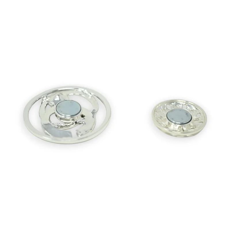 Realizzata in metallo argentato di alta qualità, questa spilla beneficia di un trattamento superficiale speciale che ne garantisce la durabilità. Il sistema di fissaggio magnetico integrato rappresenta un'innovazione tecnica che permette un'applicazione sicura e senza danni ai tessuti. La concezione modulare della spilla include: