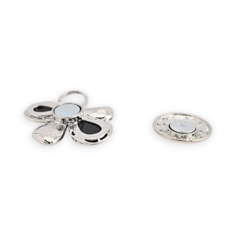 Questa spilla magnetica floreale si distingue per il suo design contemporaneo e pulito. La montatura in metallo argentato presenta finiture curate con contorni delicatamente lavorati che incorniciano ogni petalo. Le pietre nere e grigie creano un contrasto sorprendente con la lucentezza argentata del metallo, offrendo una sofisticata armonia visiva. Il motivo floreale a cinque petali, con un diametro totale di 5,5 cm, è perfettamente proporzionato per decorare elegantemente qualsiasi tipo di indumento senza essere troppo imponente.